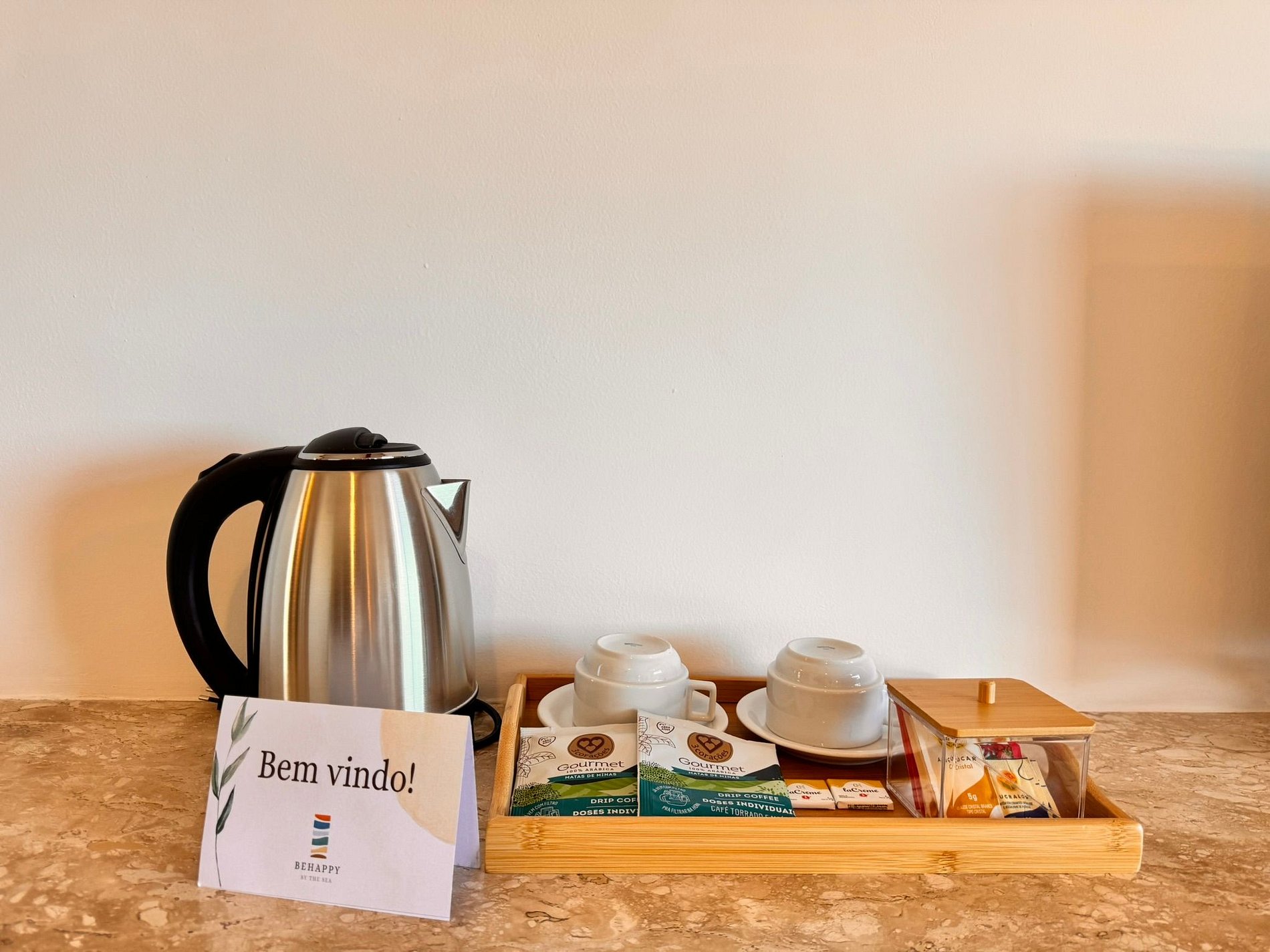 A suíte conta com ar-condicionado, chuveiro a gás, frigobar e vista para a praia, sendo ideal para estadias curtas ou longas.