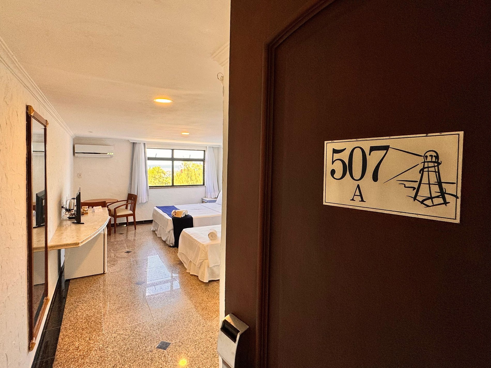 A suíte possui ar-condicionado, chuveiro a gás, frigobar e vista para a praia, em um local ideal para estadias curtas ou longas.