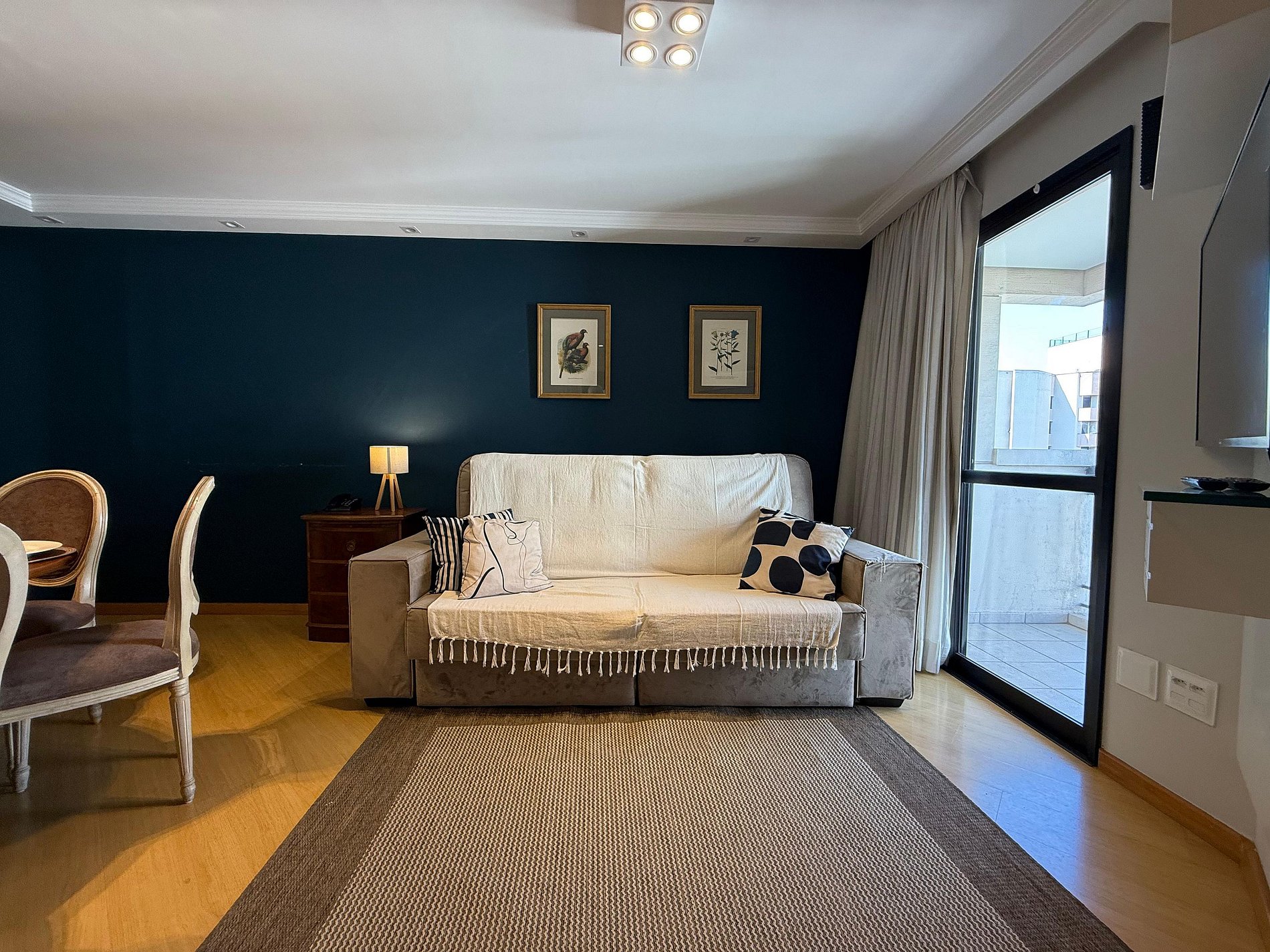 - Sala com sofá retrátil (2,00m x 0,98m), Smart TV 43” com TV a cabo