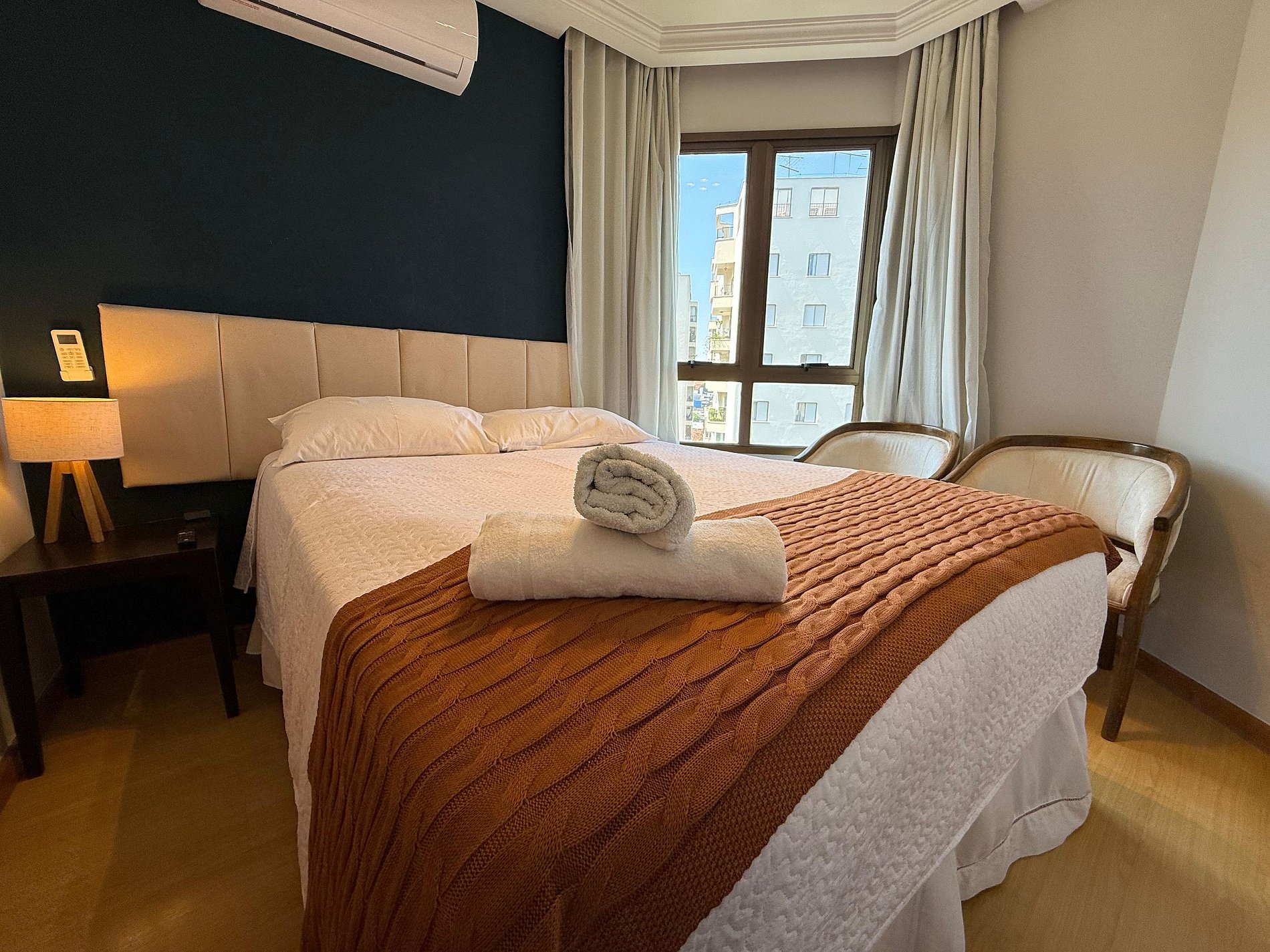 1. Lembramos que sua reserva é para um apartamento de temporada (condomínio residencial). 2. Não temos serviço de quarto e não servimos nenhum tipo de refeição ou café da manhã. A higienização do apartamento (recolher lixo, limpeza do piso, arrumar a cama) é oferecida diariamente sem custo adicional. 3. Não possuímos rede de proteção nas janelas e varanda.